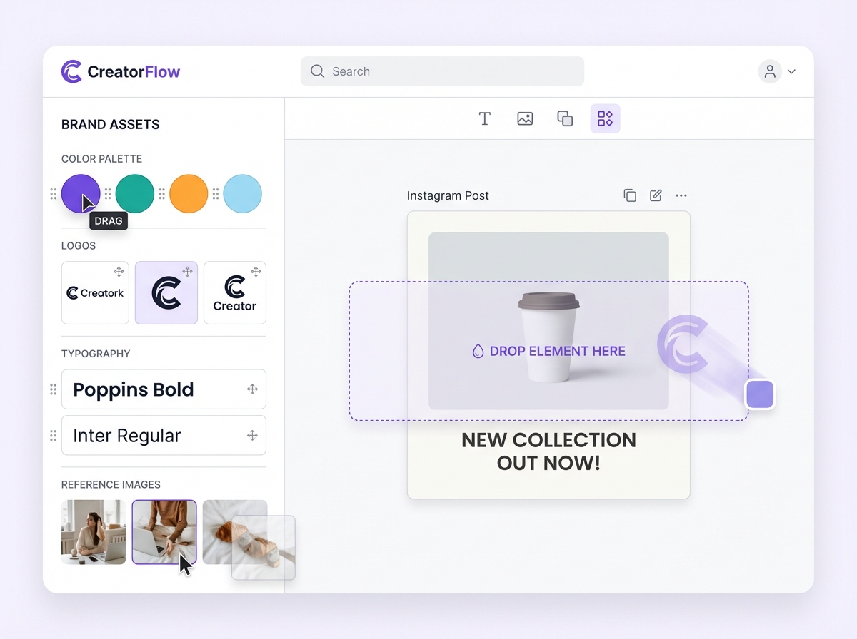 Post laboratory incluye un sistema de contexto que te permite influir en la generación arrastrando elementos directamente al lienzo: tus colores de marca, logos en diferentes versiones, fuentes, imágenes de referencia y bloques de texto. Cuanto más contexto aportas, más precisa y alineada con tu visión es la imagen resultante. No es prompts cruzando los dedos. Es un flujo de trabajo diseñado para que los profesionales de marketing tengan control real sobre el output.